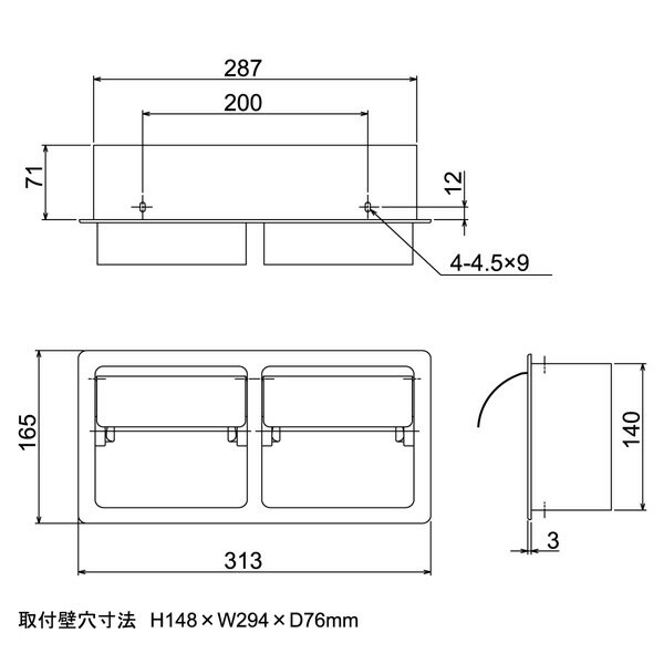 □材質:真鍮 □製品サイズ(mm):H165xW313 取付壁穴寸法:H148xW294xD76□仕上:クロムメッキ □浴室可否:浴室可 【使用紙サイズ(mm)】紙幅114±2芯の径38±1巻巻き取りの径115以下 ●この商品はメーカー取寄せ品です●この商品は複数店舗と在庫を共有しています●不具合ある商品、配送中の破損、商品の瑕疵のみ、商品の返品をお受けしております