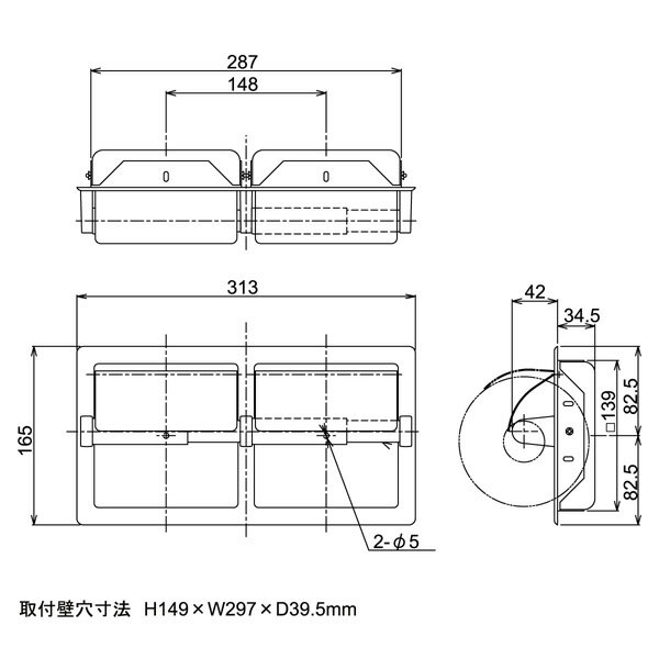 □材質:枠、カッター:ステンレス ホルダー芯受:亜鉛合金 インナーボックス:ABS樹脂 □製品サイズ(mm):H165xW313 取付壁穴寸法:H149xW297xD39.5□仕上:枠、カッター:光沢 ホルダー芯受:クロムメッキ インナーボックス:ブラック □浴室可否:浴室可 【使用紙サイズ(mm)】紙幅114±2芯の径38±1巻巻き取りの径120以下※専用金具をご採用の場合、R111-10(インストレーションクランプ、別売)をご指定ください。